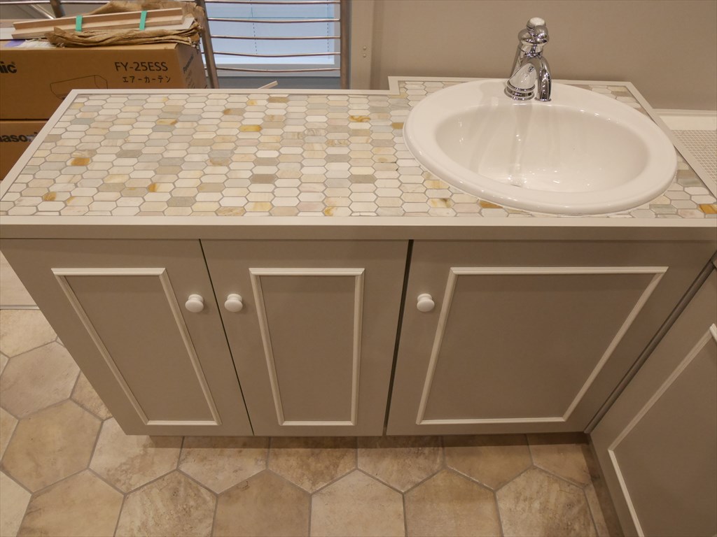 こだわりの一つが、床や手洗い場に採用したヘキサゴンタイル。