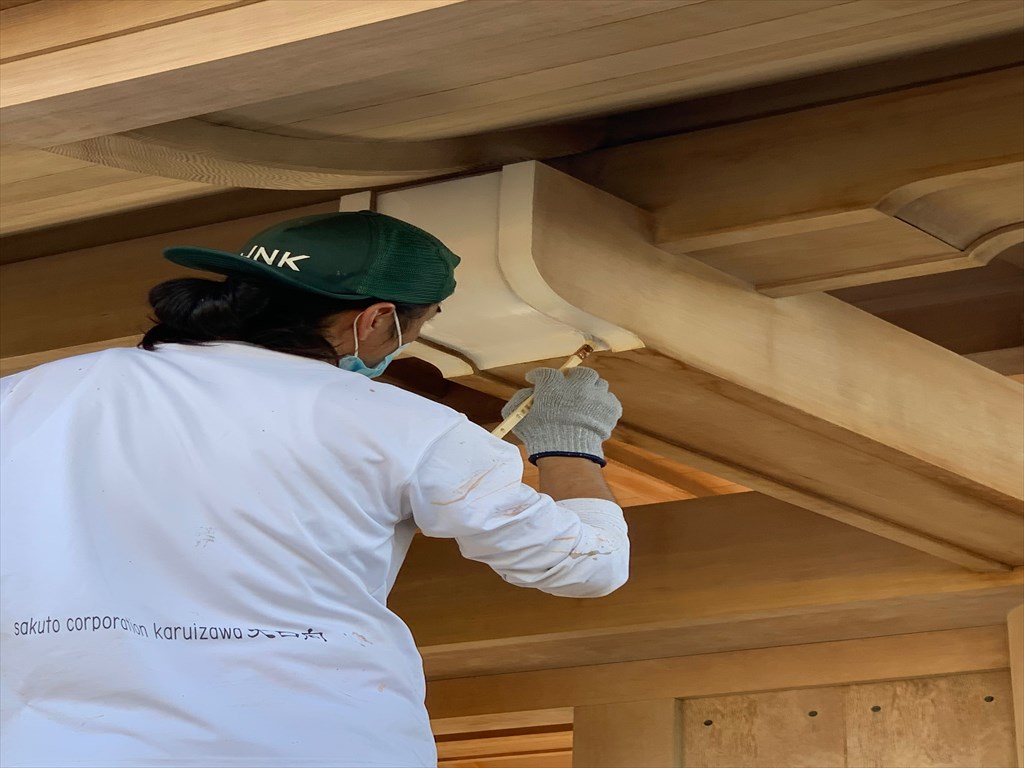 解体ができない門扉は現状のままあく洗いをし、洗浄後の状態を確認、木の本来の色をどこまで出すか、更に撥水加工をするかなど細かく施主様とやりとりをし、長く美しさを保つために、3週間という通常よりも長い時間をかけて、丁寧に作業します。
