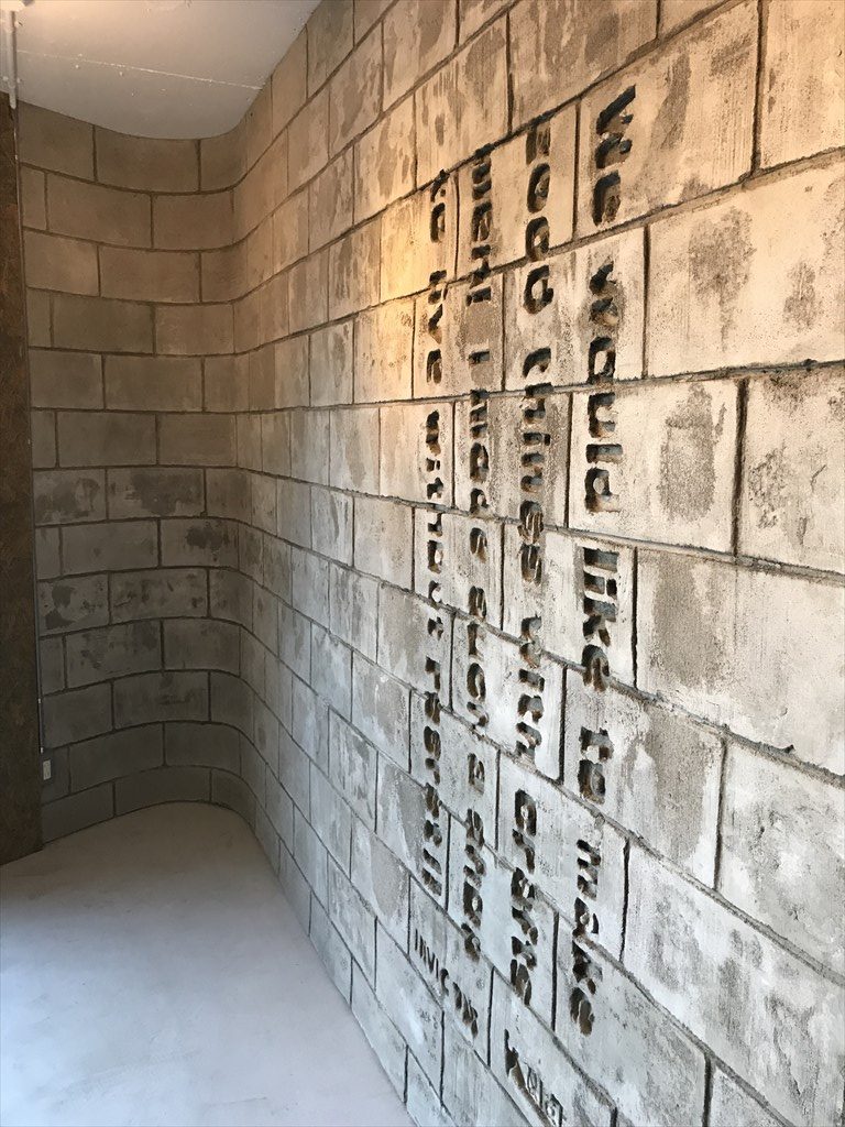 メッセージを彫り込んだ壁は、コンクリートブロックでは出来ないカーブ面を、モルタル仕上げにより表現。