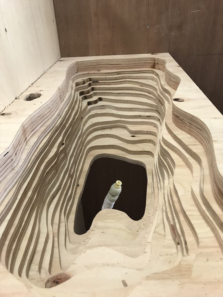 地層のような断面の洗面ボウルは、木で造作した完全オリジナル品です。