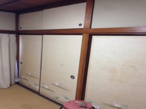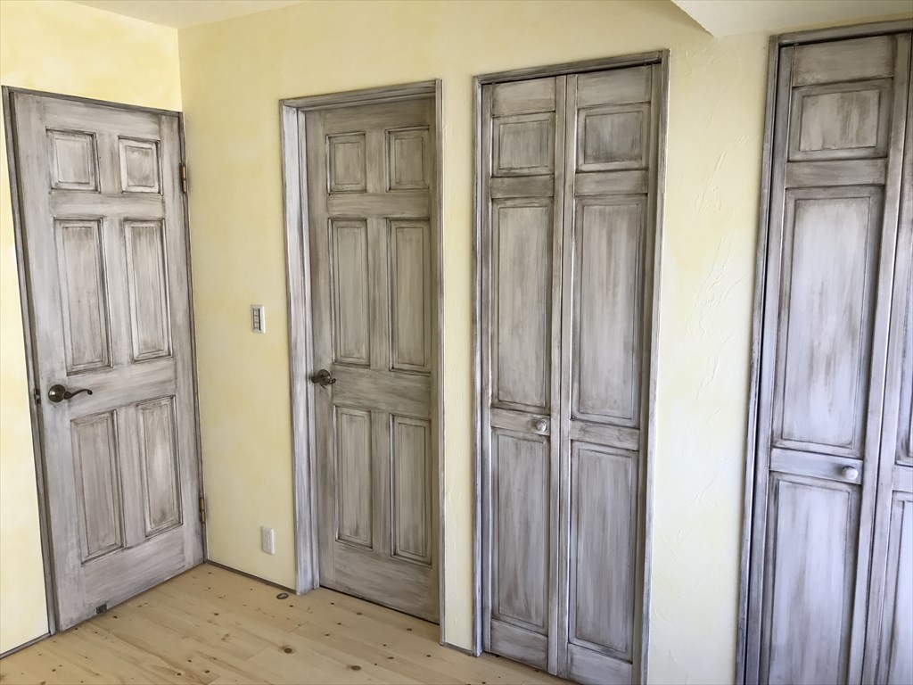 お住まいの各居室へは、古びたふすまを、東欧アンティーク調の木の扉に変更。