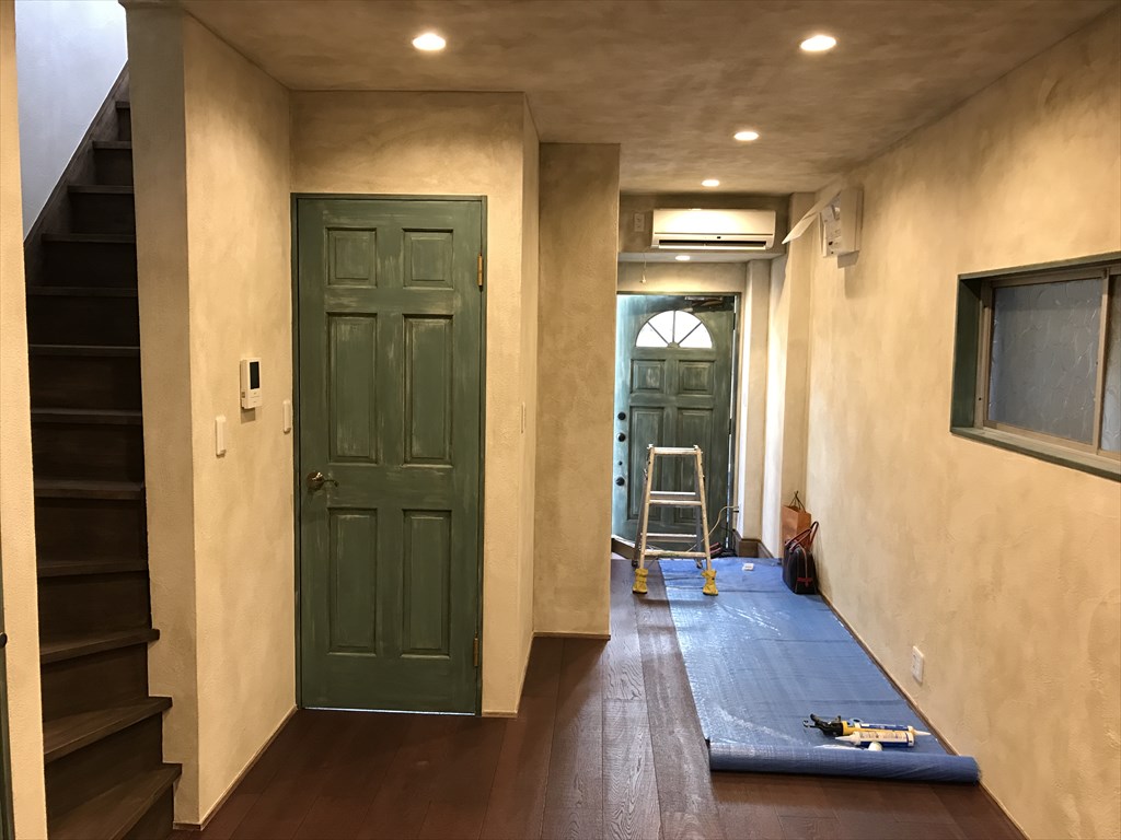 玄関扉は、明り取りの窓を設けた、まるでヨーロッパの路地裏に出会いそうなシャビ―な雰囲気の扉に変更。